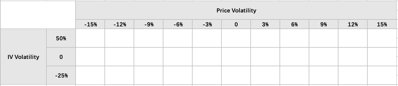 لقد صممنا مصفوفة سيناريوهات لاختبار الضغط استنادًا إلى سعر الأصل الأساسي والتقلب الضمني، لحساب الربح والخسارة في جميع سيناريوهات الاختبار (PnL = قيمة المركز في سيناريو الاختبار - القيمة الفعلية للمركز).