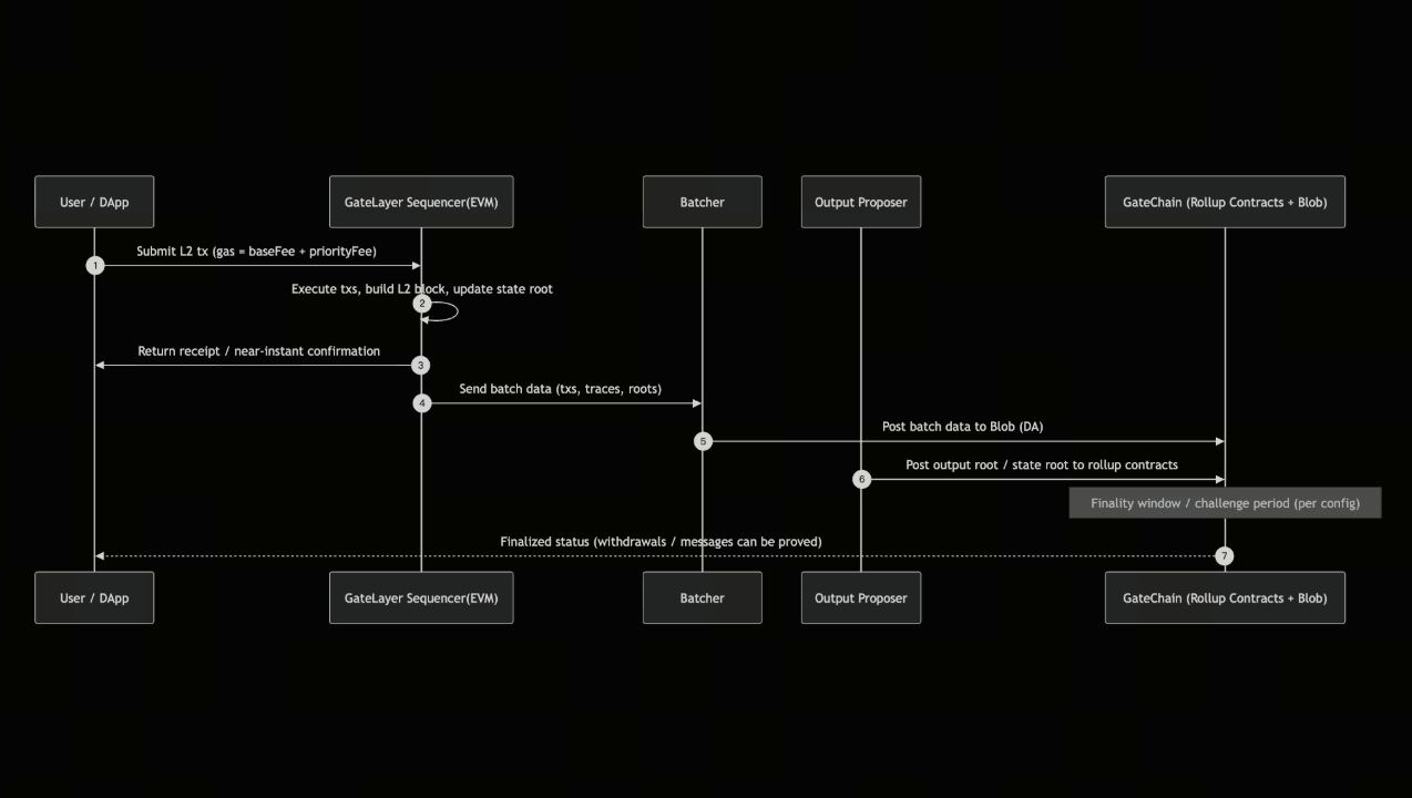 على Gate Layer، تمر المعاملة بعدة مراحل تعكس منطق التجميع المتفائل (Optimistic Rollups):