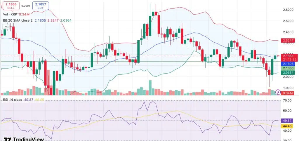 من الناحية التقنية، في وقت كتابة هذا، كان سعر تداول XRP 2.185 دولار. يحاول السعر حاليا اختراق خط الانحدار المتحرك البسيط لمدة 20 يومًا البالغ 2.18 دولار، مما يشير إلى احتمال حدوث اختراق صعودي بعد ارتداد قوي بالقرب من النقطة المنخفضة الأخيرة عند 2.03 دولار. تشير القناة العلوية لبولينجر إلى تقلص في التقلبات، مما قد يشير إلى حدوث تقلبات أكبر.