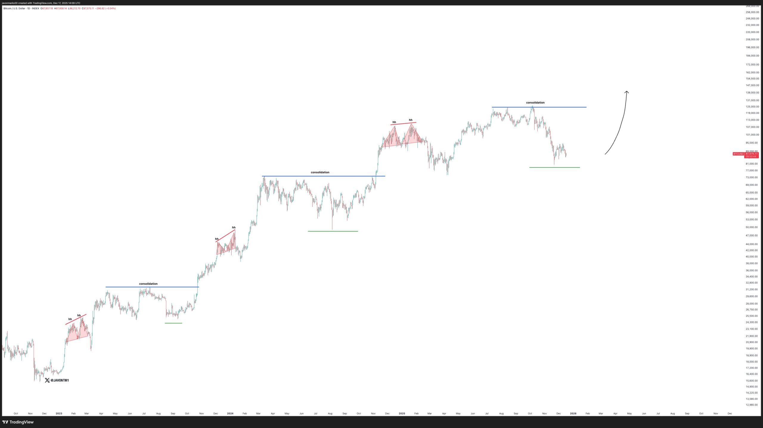 وفقًا لمحلل التشفير JAVON، فإن الهيكل السعري الحالي لبيتكوين يشبه عن كثب كسرًا متكررًا ظهر عدة مرات طوال الاتجاه الصعودي الكلي الجاري. تاريخيًا، اتبعت بيتكوين إيقاعًا ثابتًا: ارتفاعًا حادًا مفاجئًا، يتبعه مرحلة تصحيح تتميز بالتوحيد وارتفاعات أدنى، قبل استئناف مسارها الصعودي الأوسع.