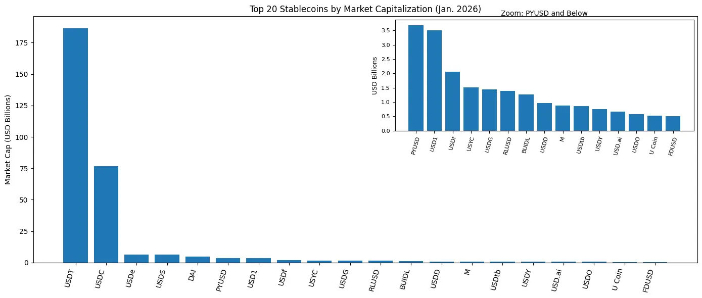 تشير الأرقام الأخيرة خلال الأيام السبعة الماضية إلى سوق عملات مستقرة لا تقتصر على تسجيل أرقام قياسية جديدة فحسب، بل توسع قاعدته أيضًا، مع انتشار المكاسب بشكل كبير خارج الأسماء الثقيلة المعتادة. بينما تراجعت بعض الرموز، دخل معظم القطاع عام 2026 بتدفقات جديدة، وتغييرات في التصنيفات، ومجموعة متزايدة من المنافسين يضيفون وزنًا بهدوء إلى إجمالي يزيد عن (مليار.