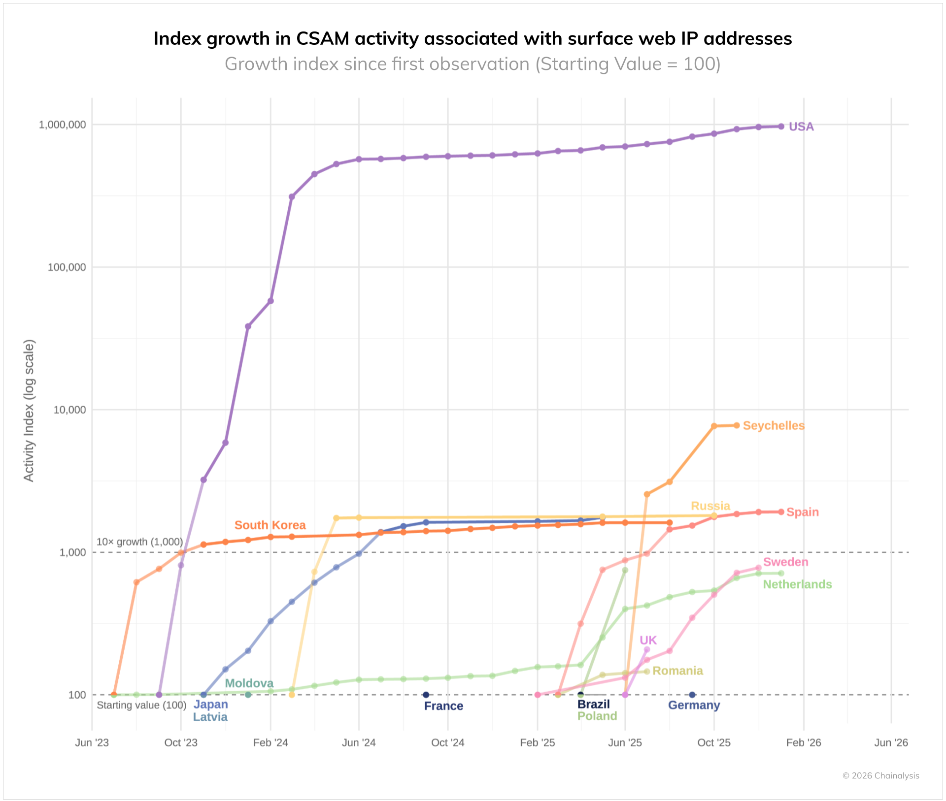 وفقًا لتقرير شركة تحليل blockchain Chainalysis الصادر بعنوان «تقرير جرائم التشفير لعام 2026» (2026 Crypto Crime Report)، شهدت معاملات العملات المشفرة المرتبطة بأنشطة محتملة تتعلق بالاتجار بالبشر نموًا هائلًا بين عامي 2024 و2025، حيث بلغت الزيادة 85%. على الرغم من أن التقرير يشير إلى أن هذا مجرد تقدير محافظ عليه، إلا أن التدفقات المالية المراقبة وصلت إلى مئات الملايين من الدولارات.