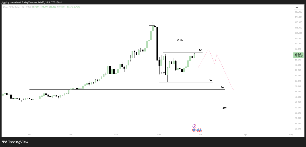 منذ ذلك الحين، بدأ السعر في الاستقرار وتشكيل قيع أعلى، عائداً تدريجياً نحو منطقة 90–95 دولار. هذه المنطقة مهمة لأنها كانت سابقًا بمثابة سقف. آخر مرة وصل فيها الفضة إليها، تغلب البائعون على المشترين واضطروا إلى تراجع عميق.