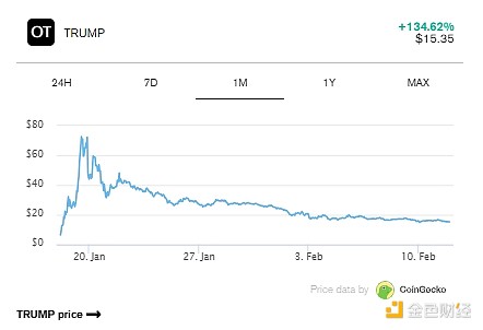 تصاعد ترامب إلى أكثر من 73 دولارًا يومًا قبل حفل تنصيب الرئيس، لكن القيمة تراجعت بشكل حاد بعد ذلك. يشير CoinGecko إلى أن سعره حاليًا 15.42 دولارًا، أقل بنسبة تقريبًا 80% من ذلك الرقم القياسي.