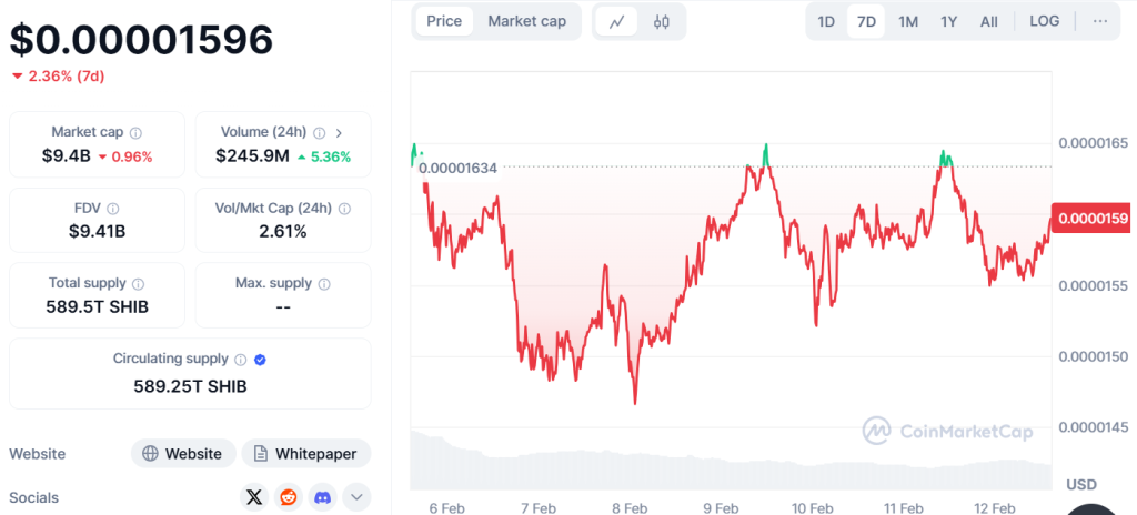 في تطور آخر، ارتفع معدل حرق SHIB بنسبة 389.77٪. ومع ذلك، استمر سعر SHIB في التداول بين 0.00001523 دولار و 0.0000165 دولار منذ 6 فبراير 2025