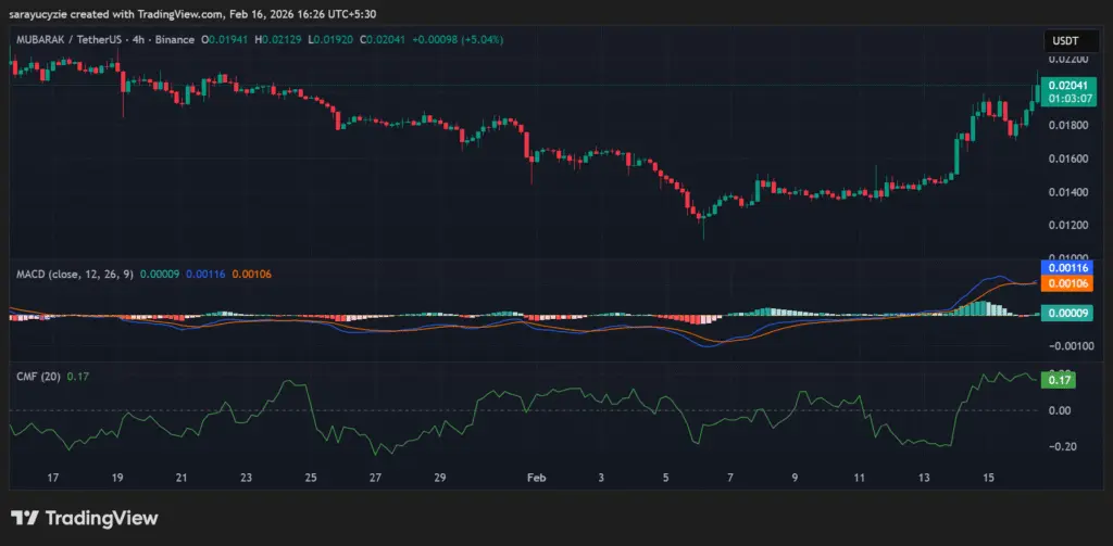 MUBARAK-Chart (Quelle: TradingView) Außerdem befindet sich der Chaikin Money Flow (CMF) bei 0,17 Punkten, was auf einen moderaten Kaufdruck hindeutet. Zudem fließt Geld in den Vermögenswert, was die bullishe Stimmung unterstützt, und die Stärke ist stabil, nicht aggressiv.