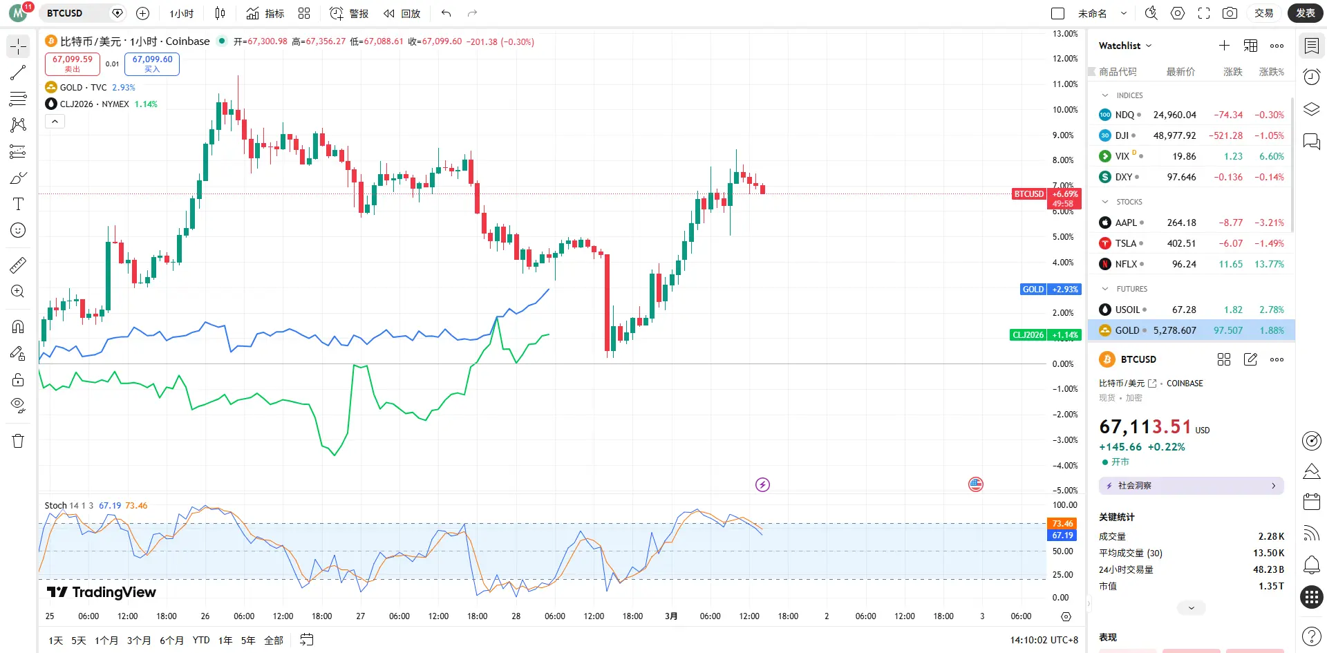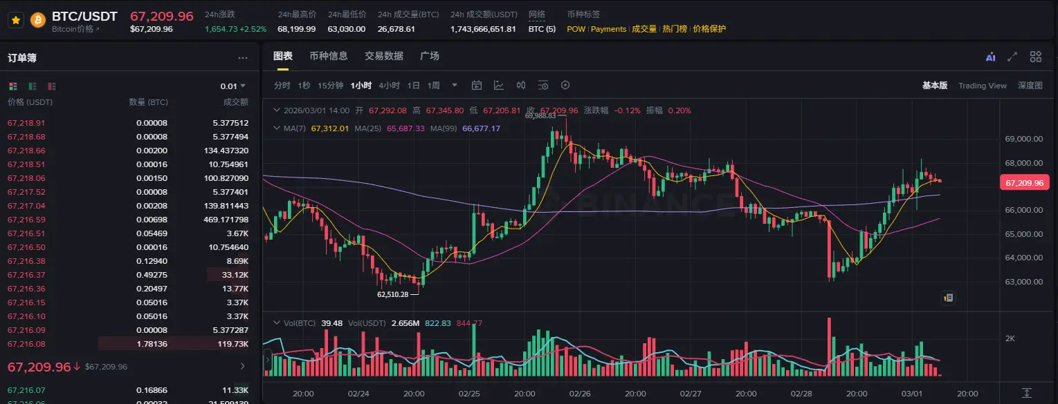 Unter Einbeziehung der Spot- und Kontrakt-Daten von Binance (Stand 1. März 2026, 14:00 Uhr) schwankt der BTC/USDT-Kurs um die Marke von 67.392 USD. Trotz dieser bedeutenden Krise hat Bitcoin im Vergleich zu den Ereignissen von 2020 („312“-Crash) seine Unterstützung bei 67.000 USD gehalten.
