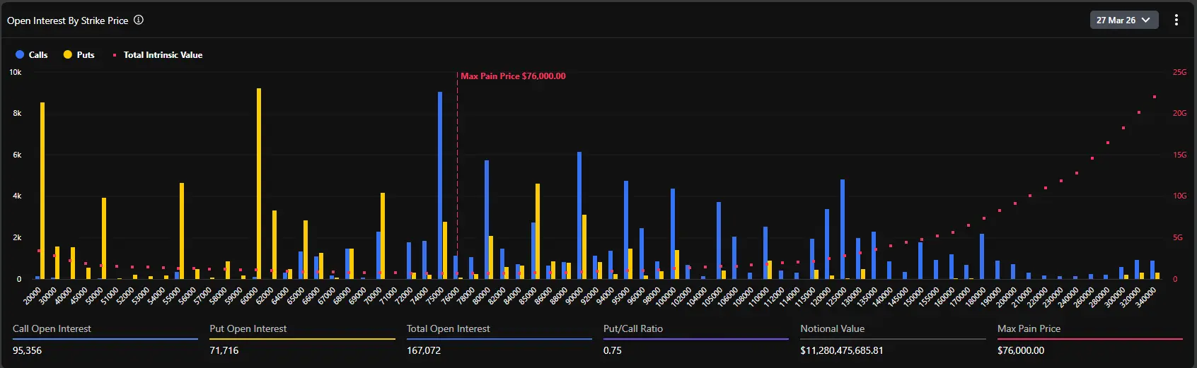 Die Verteilung der offenen Kontrakte (Open Interest) bei den Optionen zeigt, dass der maximale Schmerzpunkt bei 76.000 USD liegt – eine hochspekulative und kontroverse Zahl.