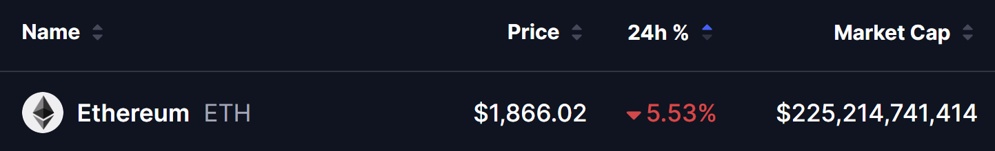 In diesem Zeitraum fiel der ETH-Kurs um 5,7 % von 1.988 USD auf 1.875 USD, was an einen früheren größeren Verkauf erinnert, bei dem ETH um 22,7 % von 2.360 USD auf 1.825 USD fiel.