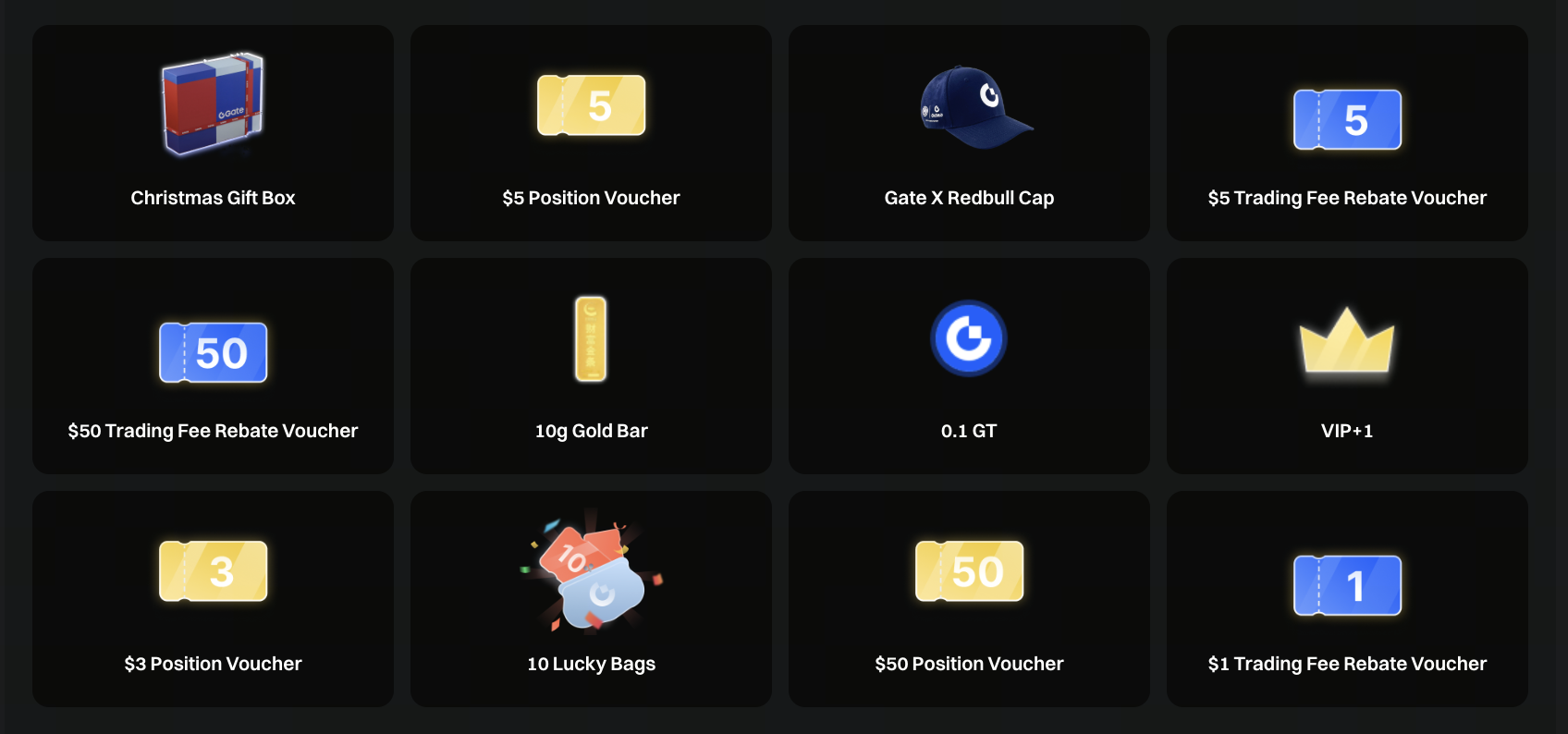 - Los Cupones de posición, tokens y Bolsas sorpresa se distribuirán en un plazo de 30 días laborables tras la finalización del evento. Las recompensas de merchandising se enviarán en un plazo de 60 días tras el final del evento. Tras la verificación, se enviarán las recompensas. Por favor, mantente atento a la información logística. Si la entrega falla por motivos logísticos, el merchandising se emitirá como un Cupón de posición equivalente (el Lingote de oro se emitirá como Cupón de posición de $1 000, la Caja de regalo de Navidad Gate como Cupón de posición de $200, la Gorra Gate × Red Bull como Cupón de posición de $20).