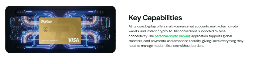 Digitap se presenta como el primer “omni-banco” del mundo. Esto significa que los usuarios pueden gestionar tanto activos en fiat como en cripto de manera fluida a través de una sola interfaz. Las características clave incluyen más de 20 cuentas bancarias en monedas extranjeras, cuentas de ahorro de alto rendimiento, soporte para billeteras de cripto para más de 100 tokens, transferencias de dinero globales y una tarjeta de débito Visa.