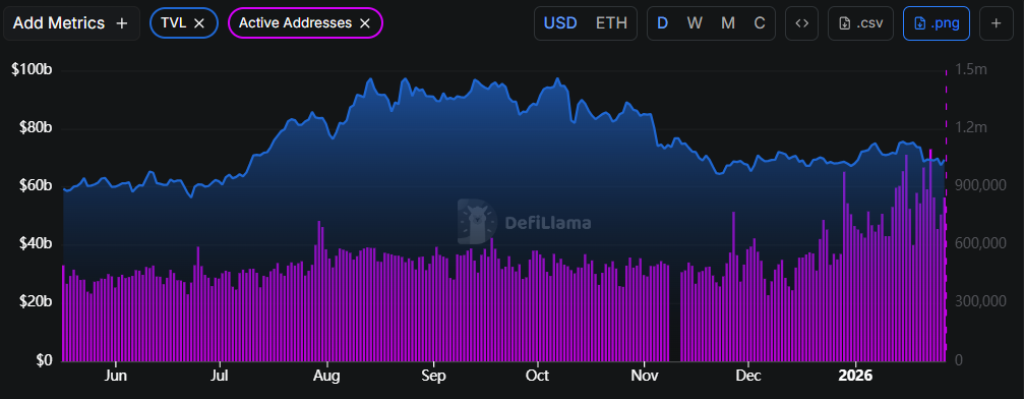Aún así, Ethereum sigue siendo la plataforma dominante de contratos inteligentes, y su posición en el mercado es fuerte. El valor total bloqueado en finanzas descentralizadas ha bajado desde picos recientes, pero aún se sitúa cerca de $60 mil millones, lo que representa aproximadamente el 57% de todos los fondos bloqueados en blockchains. Las direcciones activas también permanecen por encima de los promedios recientes.