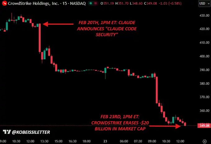La caída de CrowdStrike ($CRWD) ocurrió casi en el mismo minuto en que Claude lanzó “Claude Code Security”. El 20 de febrero, a la 1 p.m. hora del Este, Claude presentó una herramienta de IA que escanea automáticamente vulnerabilidades en el código. En solo dos días de negociación, CrowdStrike perdió 20 mil millones de dólares en valor de mercado.