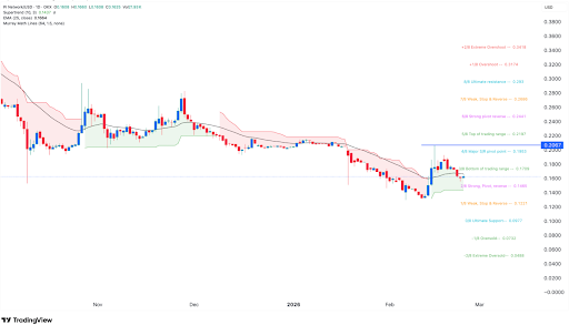 Pi Coin alcanzó un máximo reciente de $0.2067 el 15 de febrero. Luego, el precio retrocedió a aproximadamente $0.1615, según datos del gráfico diario.