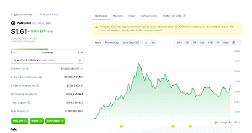 Polkadot sube un 41%, atrayendo una atención generalizada en el mercado de criptomonedas esta semana. DOT se cotiza a $1.61 en este momento, con una ganancia del 9.61% en las últimas 24 horas.