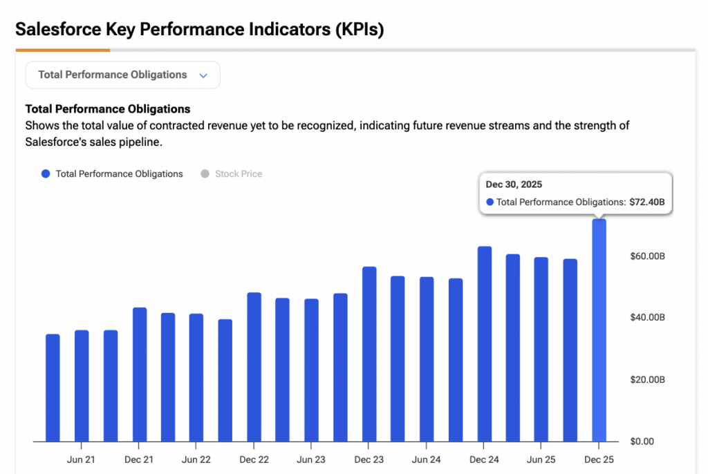 Dicho esto, no creo que sea evidente que el mercado esté acertando al incluir a Salesforce en la categoría de empresas que la IA simplemente va a interrumpir. Los números más recientes, reportados en febrero, aún indican un negocio muy saludable: los ingresos trimestrales crecieron un 12% interanual, la obligación de rendimiento restante (RPO) total alcanzó los 72.400 millones de dólares, y la guía para FY27 se sitúa en un punto medio de aproximadamente 46.100 millones, lo que representa un crecimiento interanual del 11%, junto con márgenes operativos no-GAAP del 34.3%.