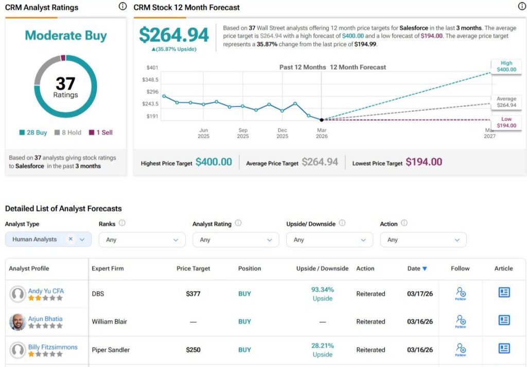 A pesar del reciente momentum bajista de Salesforce, los analistas siguen siendo bastante optimistas respecto a CRM en los próximos 12 meses. De las 37 calificaciones emitidas en los últimos tres meses, 28 son de Compra, ocho de Mantener y solo una de Venta, resultando en un consenso de “Compra Moderada”. El precio objetivo promedio es de $264.94, lo que implica un potencial alcista de aproximadamente 35.9% desde el precio actual de la acción.