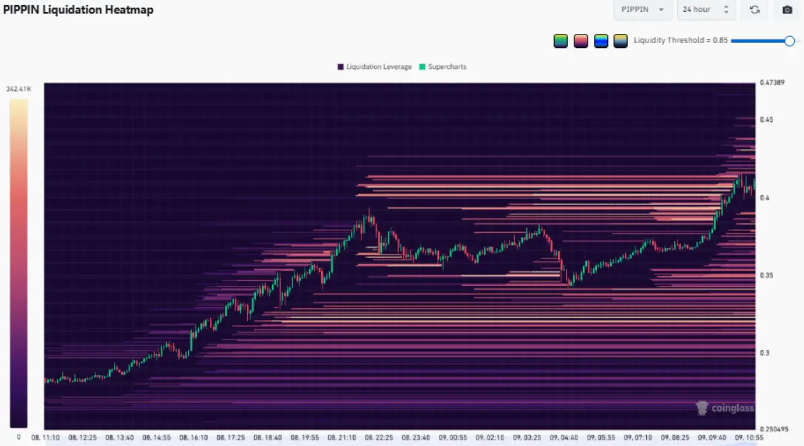 Source : CoinGlassInversement, les positions long s’accumulent en dessous de 0,40 USD, avec des clusters de liquidités les plus denses dans la zone 0,31 – 0,35 USD. C’est également cette zone que PIPPIN pourrait revisiter s’il ne parvient pas rapidement à regagner les supports importants perdus.