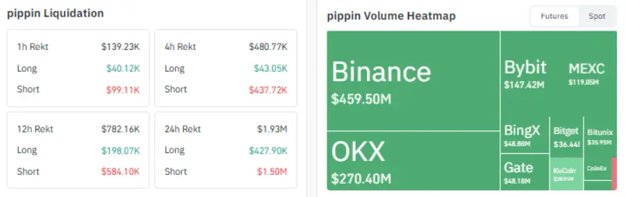 Les données de Coinglass indiquent que plus de 1,5 million de dollars en positions short ont été liquidés, tandis que la liquidation des positions long n’a atteint que 428 000 USD. Cet écart reflète une pression d’achat forcée très forte, contribuant à faire monter rapidement le prix de PIPPIN.