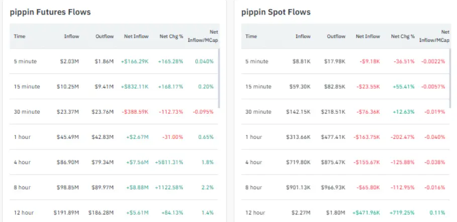 La carte thermique du volume de transactions continue de renforcer la tendance positive, avec une dominance claire du vert. Binance Futures domine le marché avec un volume de 459 millions USD, bien au-delà des autres plateformes comme OKX, Bybit, MEXC ou BingX — qui n’en enregistrent pas même la moitié. Cela montre que les flux de capitaux se concentrent fortement sur PIPPIN sur les grandes plateformes, créant une impulsion significative pour la hausse de cet altcoin.
