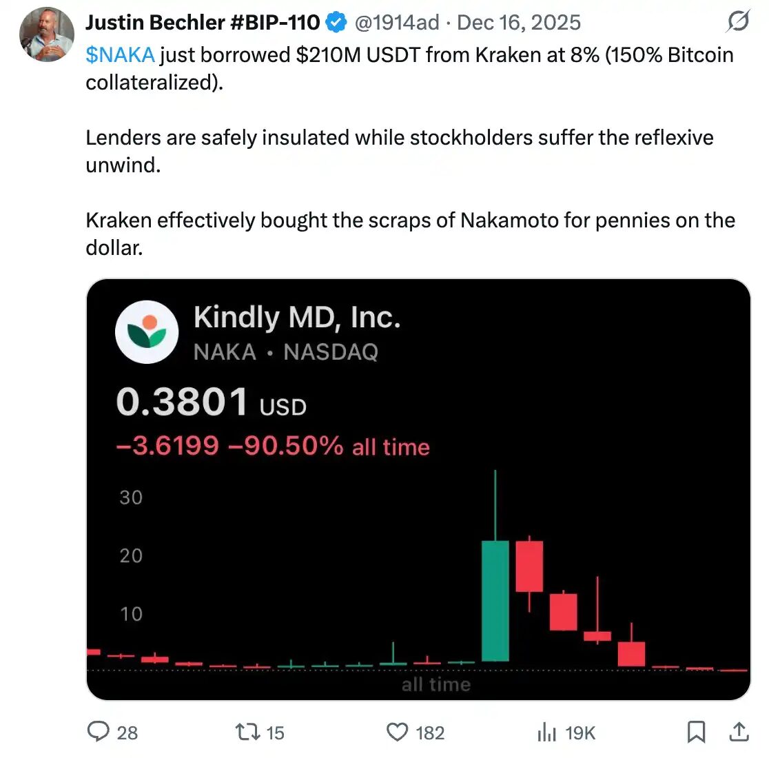 Bailey a créé Nakamoto Holdings. En le fusionnant avec KindlyMD dans une société cotée, il a levé 710 millions de dollars. Sous la poussée des petits investisseurs, le prix a été gonflé à 23 fois la valeur nette d’actif. Les investisseurs PIPE ont payé 1,12 $, alors que le public a payé 20 à 30 fois plus. Le prix s’est effondré de 99 %.