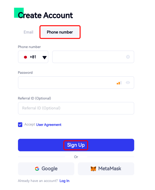 Langkah 4:Anda juga dapat mendaftar dengan nomor telepon Anda。Jika begitu,berikan semua informasi yang diperlukan(nomor telepon,kata sandi masuk,dll)。Pastikan Anda menerima Perjanjian Pengguna。Kemudian klik “Daftar“。