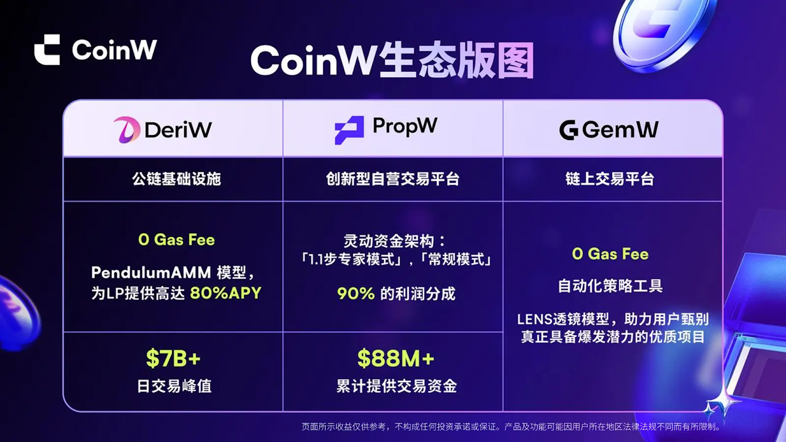 Misalnya di GemW, pengguna bisa langsung eksplorasi aset di chain, dengan biaya dan hambatan yang sangat rendah; di DeriW, yang juga menawarkan trading perpetual, struktur di chain lebih transparan, desain zero Gas membuat lebih nyaman mencoba strategi berbeda; di PropW, trading tidak lagi sekadar untung rugi sendiri, kemampuan trading pengguna bisa dianggap sebagai “skill,” dan didukung dana sesuai aturan platform, sehingga cara partisipasi pun berubah.