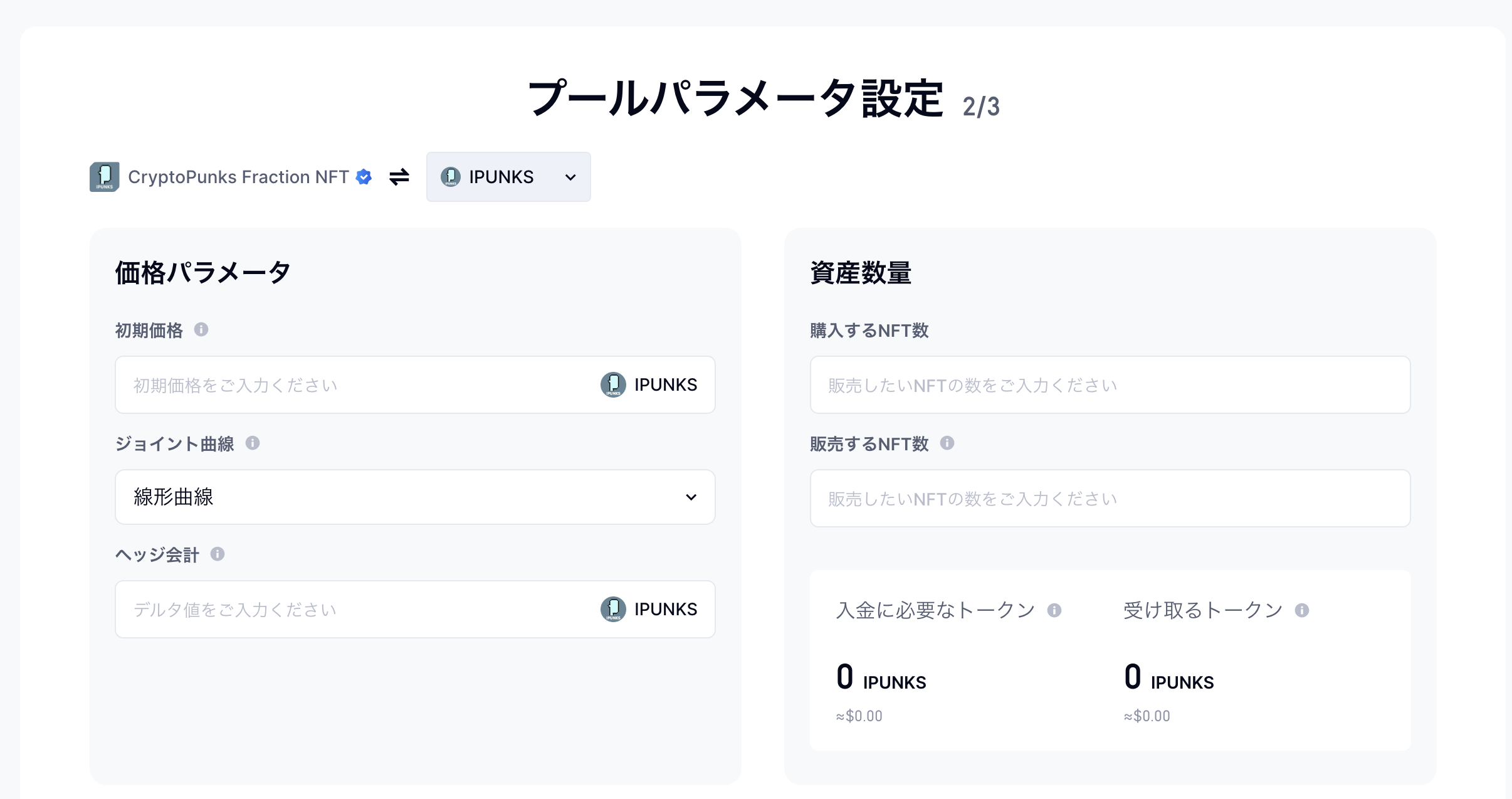 左半分は価格パラメーターの設定です。合理的なパラメータ設定が流動性プールを成功させる鍵となります。買いと売りの上限を設定すると、プロトコルがNFTとトークンの入金数を計算します。下の価格曲線を見れば取引のコストと収益を確認できます。