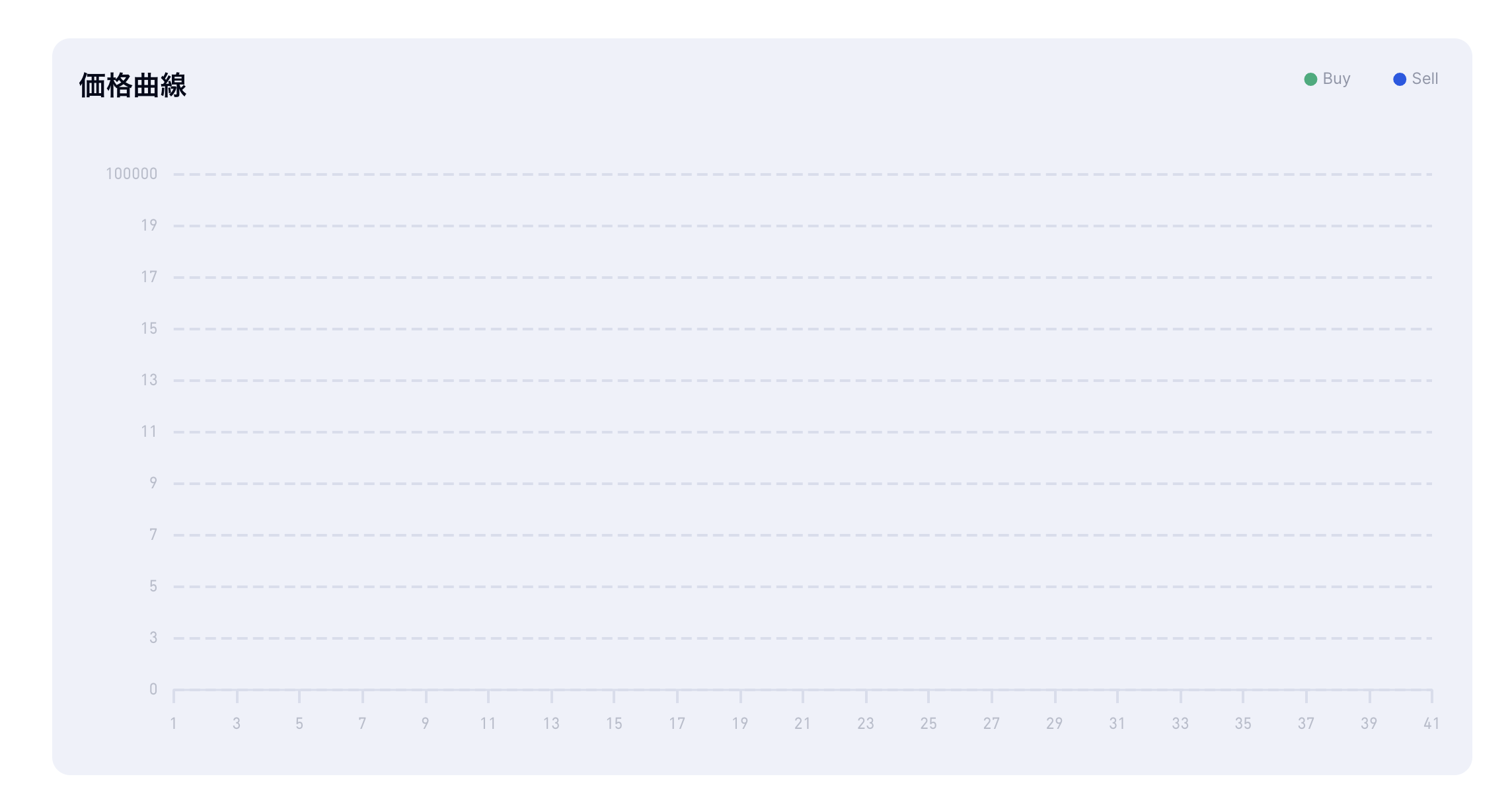 これは指数曲線の流動性プールの例で、10 NFTと10 ETHで構成されデルタは0.1です。取引が発生するたびNFT価格は1.1倍(1 + デルタ0.1)されます。