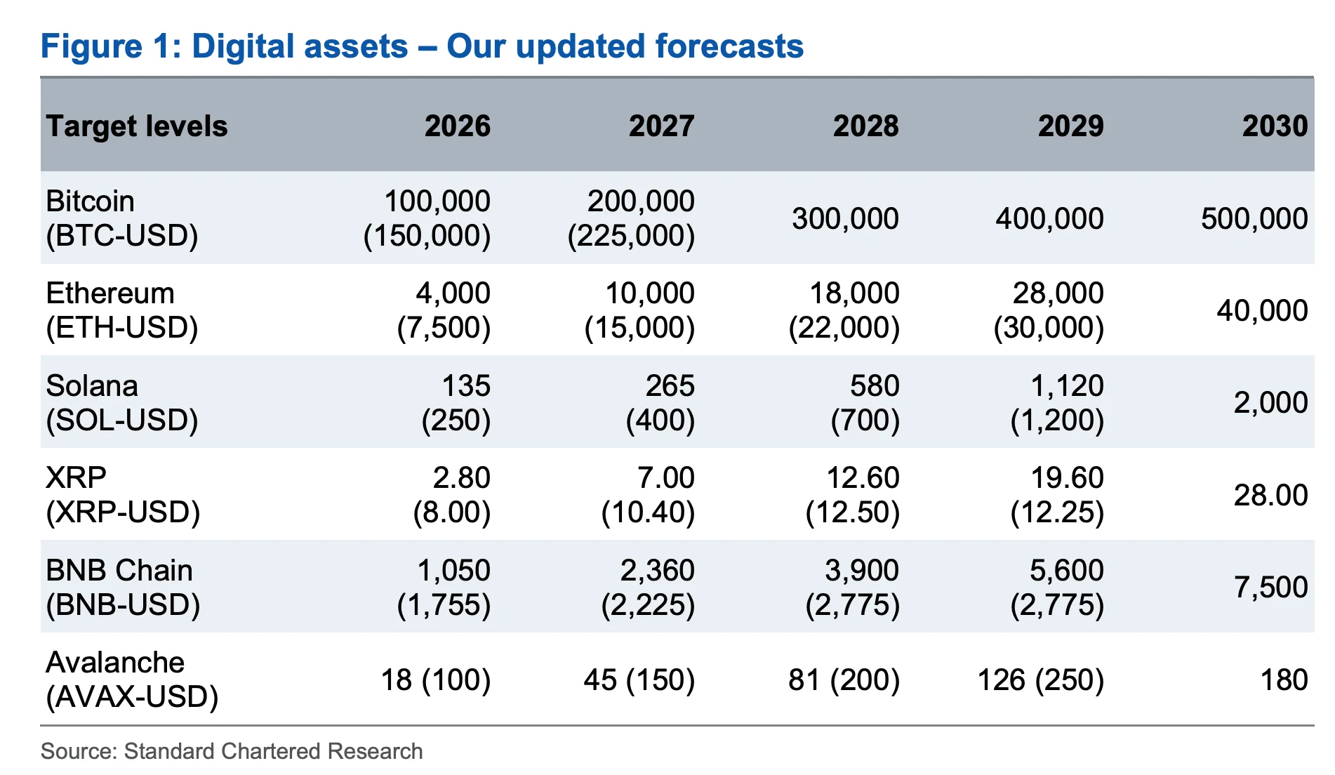 図源:The Block スタンダードチャータード銀行による2026年末暗号資産目標価格予測の修正