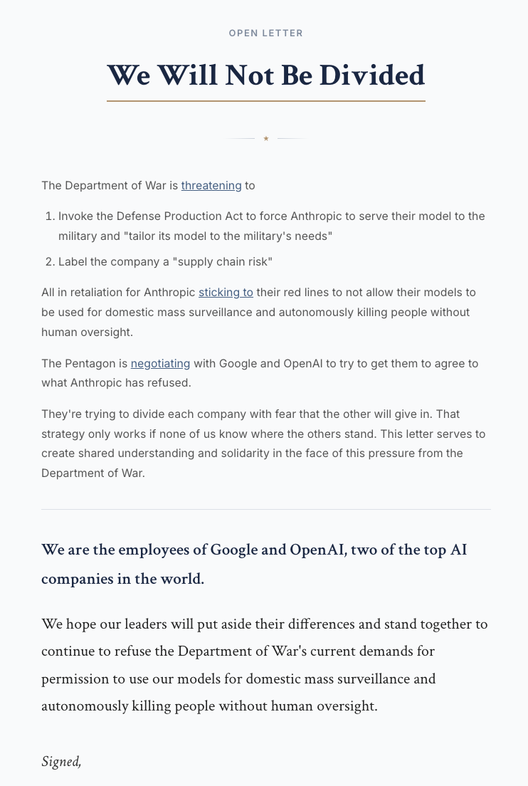 出典:NotDivided GoogleとOpenAIの200名以上の従業員が共同で、Anthropicの安全ガードレール維持の決定を支持する公開書簡に署名した。