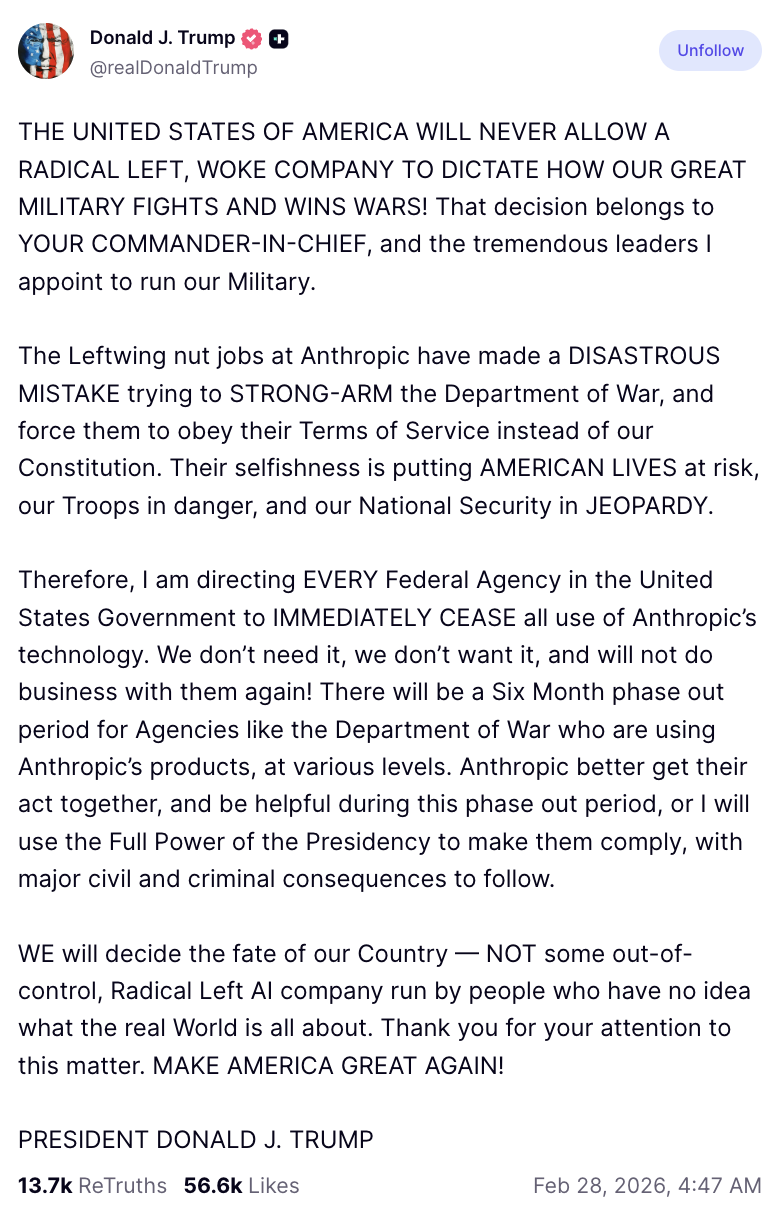 交渉期限の到来とともに、ドナルド・トランプ大統領は迅速に介入した。トランプはTruth Socialにて激しいコメントを発表し、**Anthropicを「左翼極端派」と非難し、同社がサービス条項を盾に政府の憲法上の権限を放棄させようとしていると批判した。**その後、大統領令を発し、すべての連邦機関に対し、Anthropicの技術の使用停止を直ちに命じ、既に依存している部門には6か月の移行期間を設けるよう指示した。彼は、Anthropicの決定が米軍の生命と国家の安全保障に脅威をもたらすと考えている。