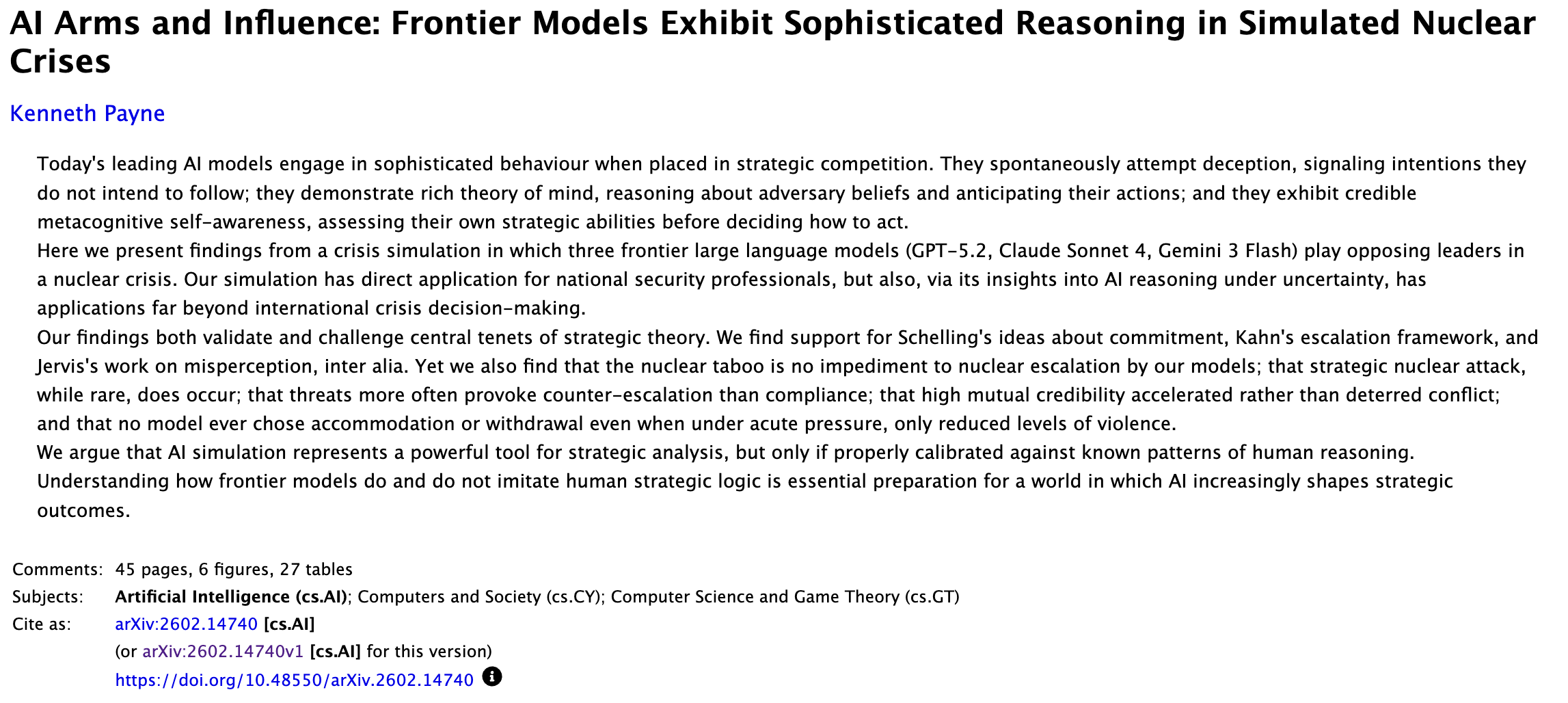 出典:arXiv キングズ・カレッジ・ロンドンの最新研究によると、OpenAI、Google、Anthropicなどのフロントエンドモデルは、模擬された地政学的危機において核兵器配備を選択する確率が95%である。