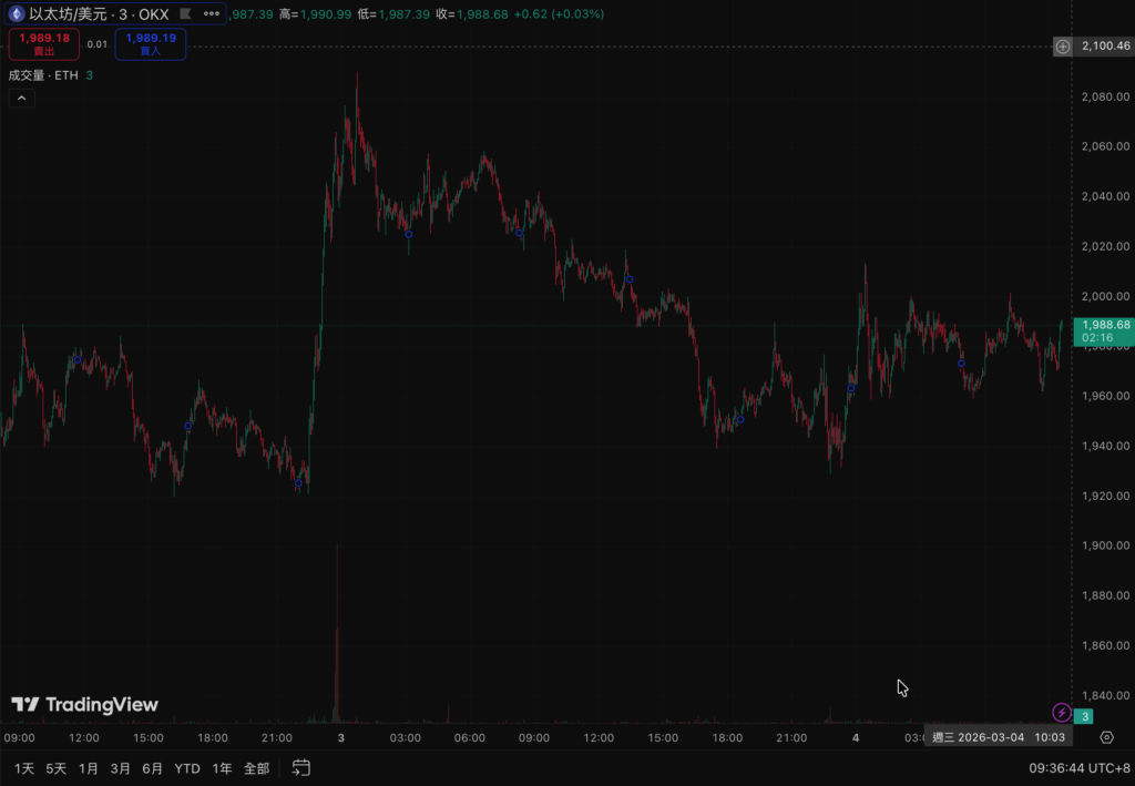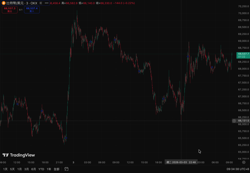 ビットコインは昨夜一度66,140ドルまで急落した後、68,549ドル付近で反発し、震蕩を続けている。イーサリアム(ETH)も同様に、1,929ドルから2,000ドルへ上昇後、再び下落し、現在は1,990ドルを維持している。