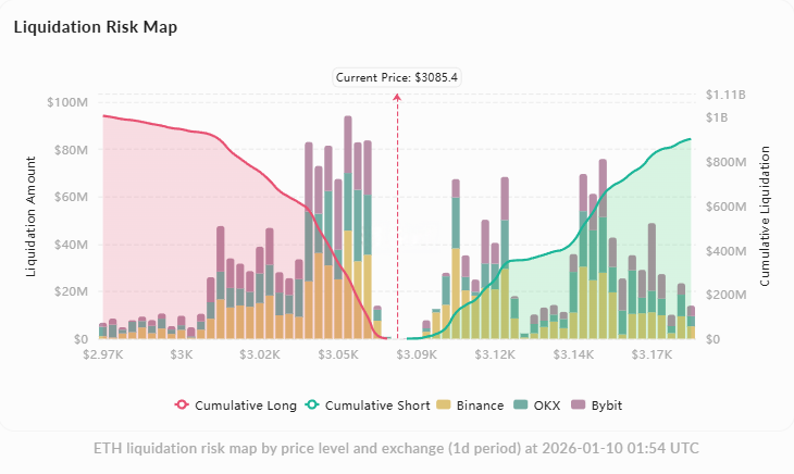 清算リスク:過去24時間で買いポジション清算$25.2M、売りポジション清算$15.6M、買い手の損失がより大きいです。清算ヒートマップは$3,000下方に累計買いポジションリスク$67M、$3,200上方に累計売りポジションリスク$75M を示し、両端が双方向の磁気吸引効果を形成しています。