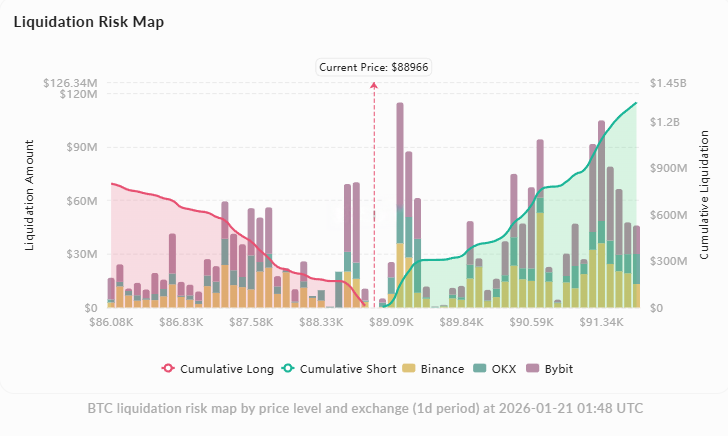 24時間の清算総額は$440Mで、ロングの清算額は$427Mとショートの$13Mを大きく上回り、下落圧力はロングの巻き込みによるものと確認。現在価格の下、$88,615付近で$170Mのロング清算、$86,077付近では$700M超の清算が発生。上方の$91,717付近ではショート清算リスクが$1.3Bに達し、非対称的な下落リスクを示す。