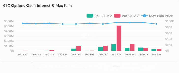 オプションの総保有額は$36.8Bで、24時間で3.72%増加。1月21日〜30日に満期の契約の最大痛点は$90,000〜92,000に集中し、この範囲が価格に引力を与える。