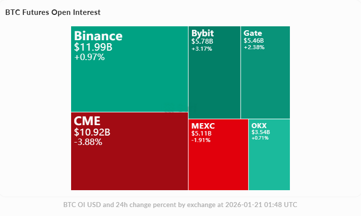 先物のポジション総額は$60.5Bで、24時間で0.97%減少し、レバレッジの縮小を示す。資金料率は微妙に正(0.01%)、ロングはわずかにショートに支払う形、多レバレッジの圧力は限定的。