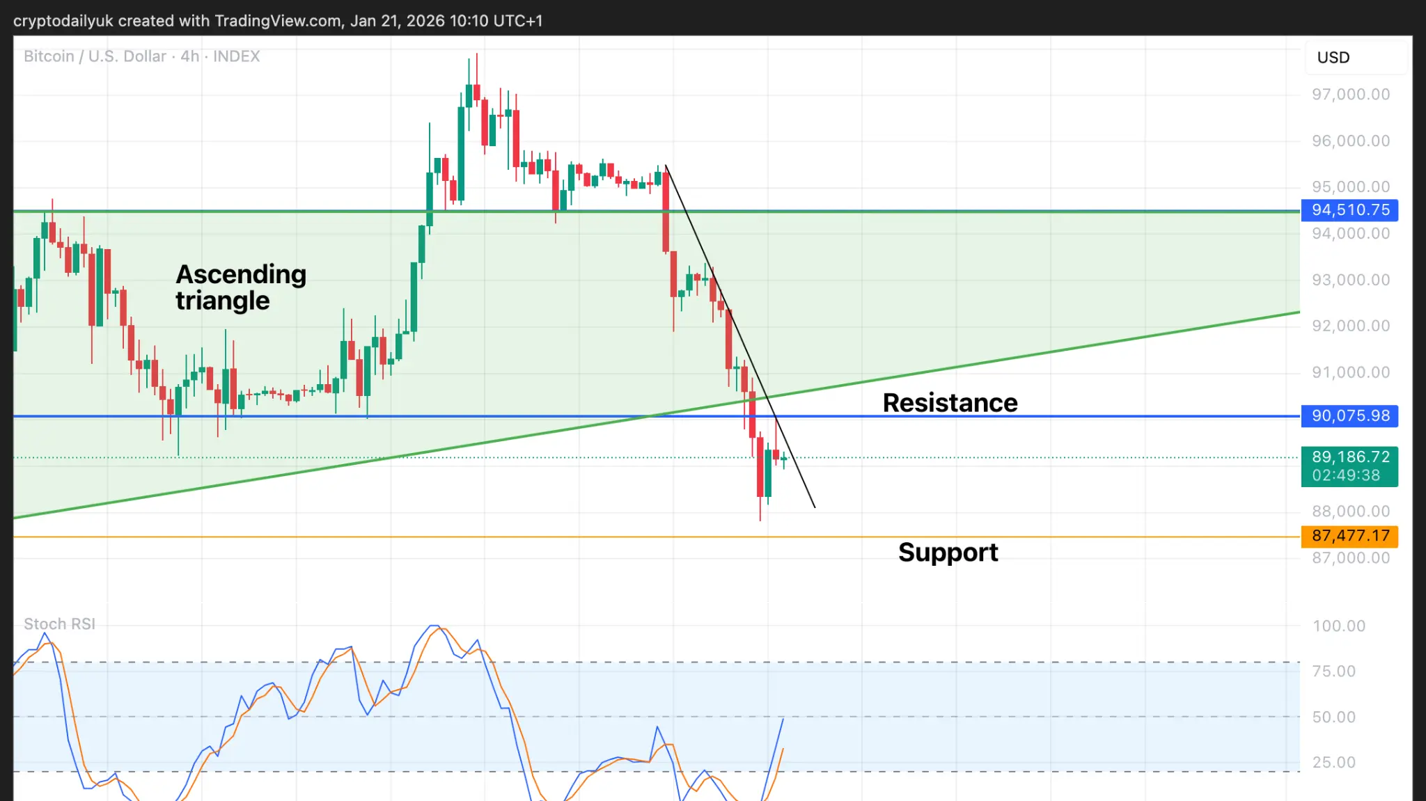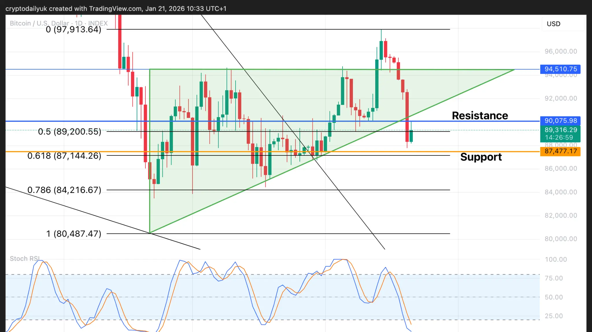 出典:CryptoDaily オリジナルタイトル:ビットコイン、$90,000サポートを下回る:弱気市場の確定か、それとも強気の希望は残るか? – BTC TA 2026年1月21日 オリジナルリンク: ダボスでの世界的な政治的混乱の中、ビットコインの価格は容赦なく打撃を受け続けている。金は新高値を記録する一方、ビットコインは重要な$90,000のサポートを下回った。ビットコインは回復できるのか、それとも売りが引き続き続くのか?