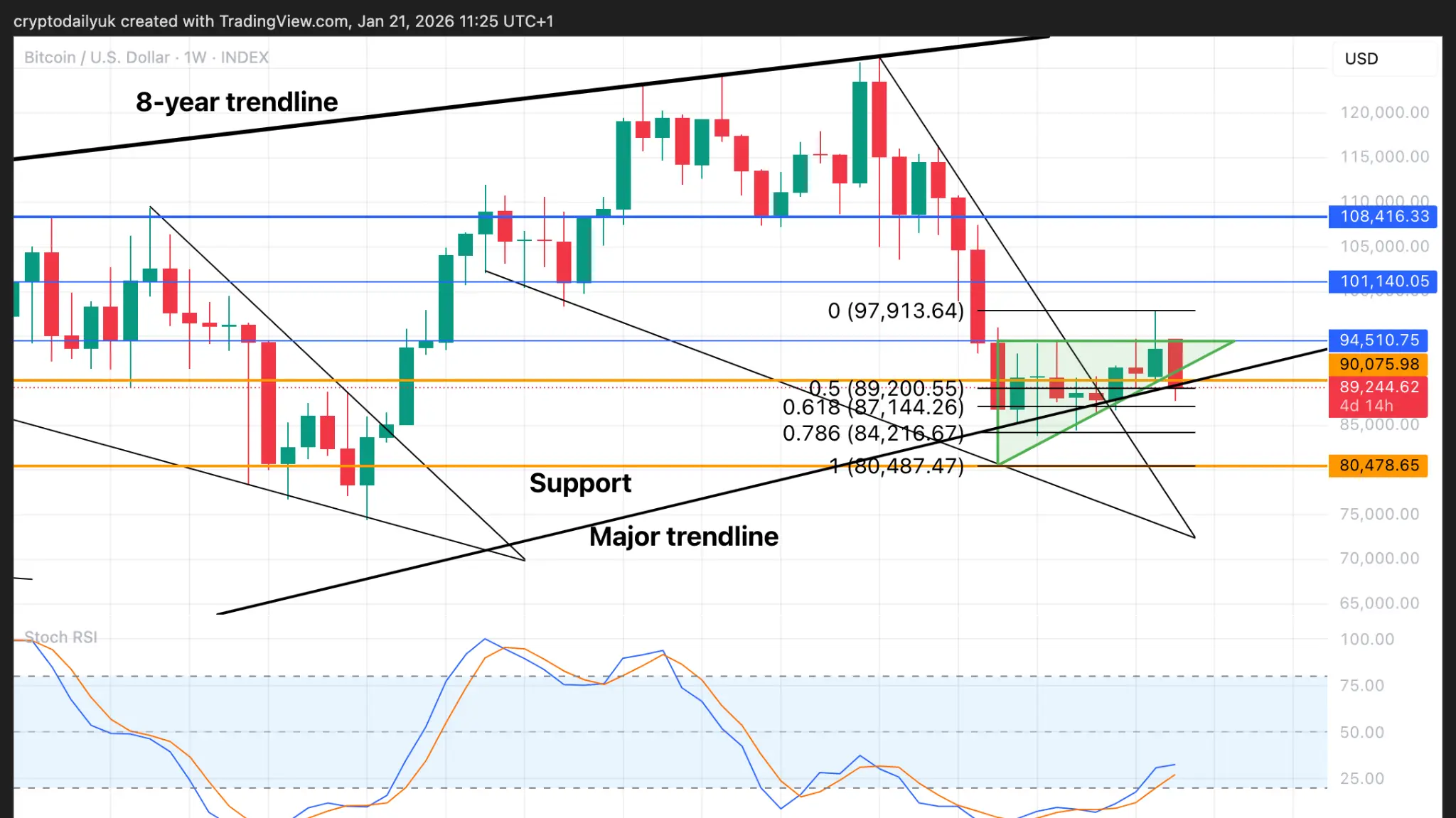 週足チャートは、主要なトレンドラインが0.5フィボナッチと$90,000レベルの中を通っていることを示している。このタイムフレームが非常に大きいため、BTC価格は今週中に$90,000を上回ってクローズし、それをサポートとして維持する可能性もある。