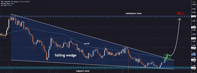 暗号アナリストのJonathan Carterは、ZROが3日チャートで下降ウェッジのブレイクアウトを確認したと述べている。アナリストによると、ブレイクアウトの構造は崩れておらず、上昇目標は2.40ドル、3.30ドル、4.80ドル、7.00ドルに設定されている。