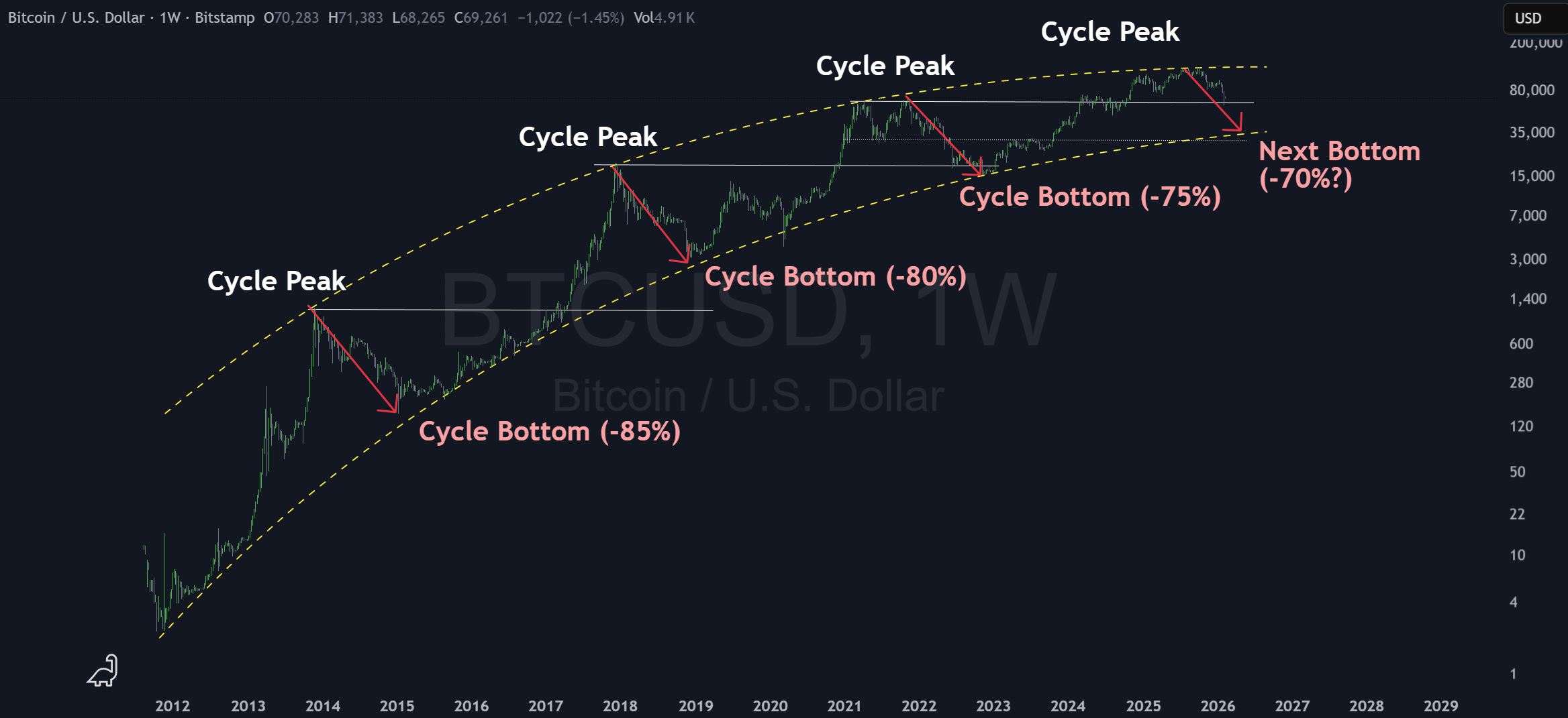 過去のサイクルに注意すれば、ビットコインは2026年まで下落を続け、その後回復に向かうと予測されます。これが最も可能性の高いシナリオです。