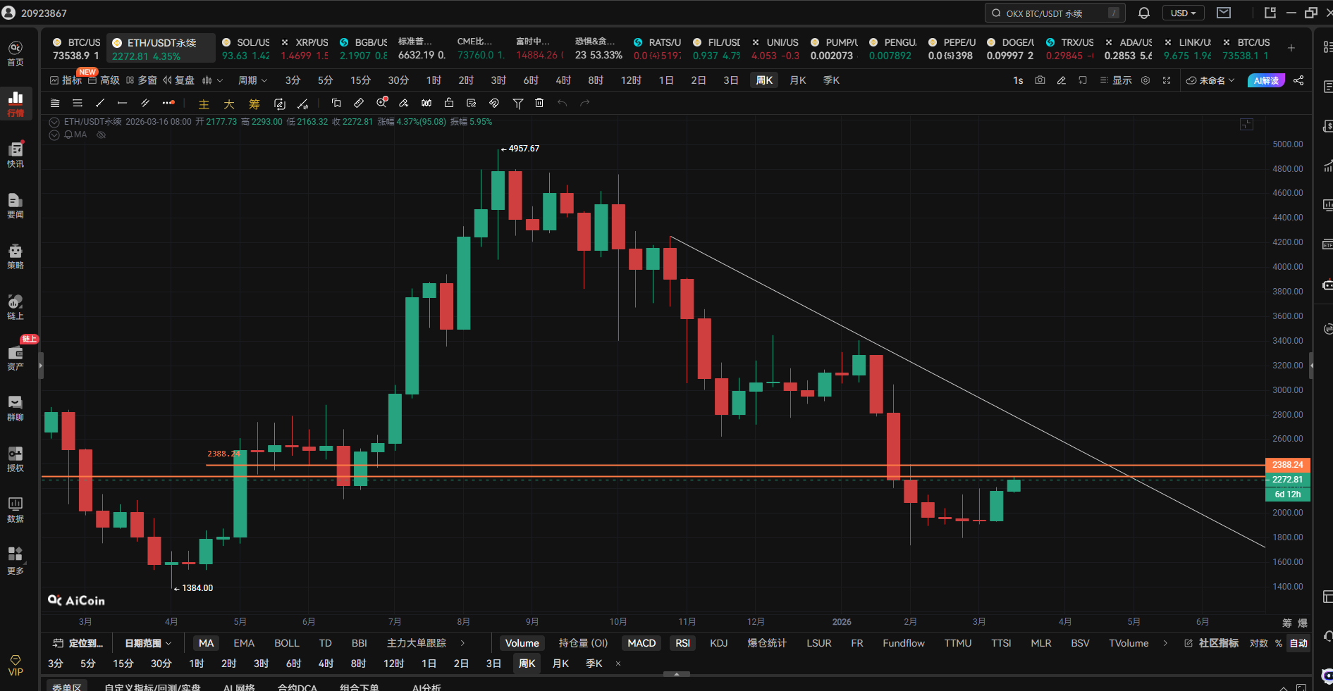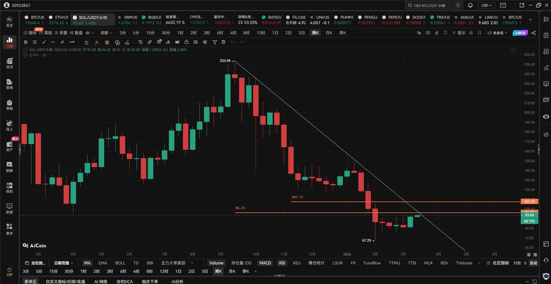 BTC、ETH、SOLは追うな!週足の下落はまだ終わっていない。黄線の抵抗に達したら、最後の突き上げに注意しろ!