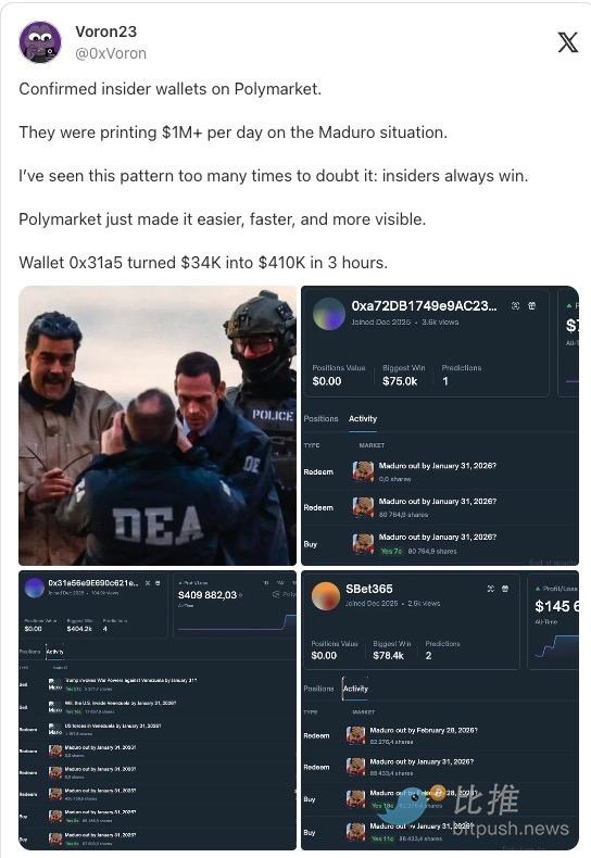 Hours later, US forces arrested Maduro and brought him to New York to face criminal charges. The account closed its position, netting over $400,000 in profit.