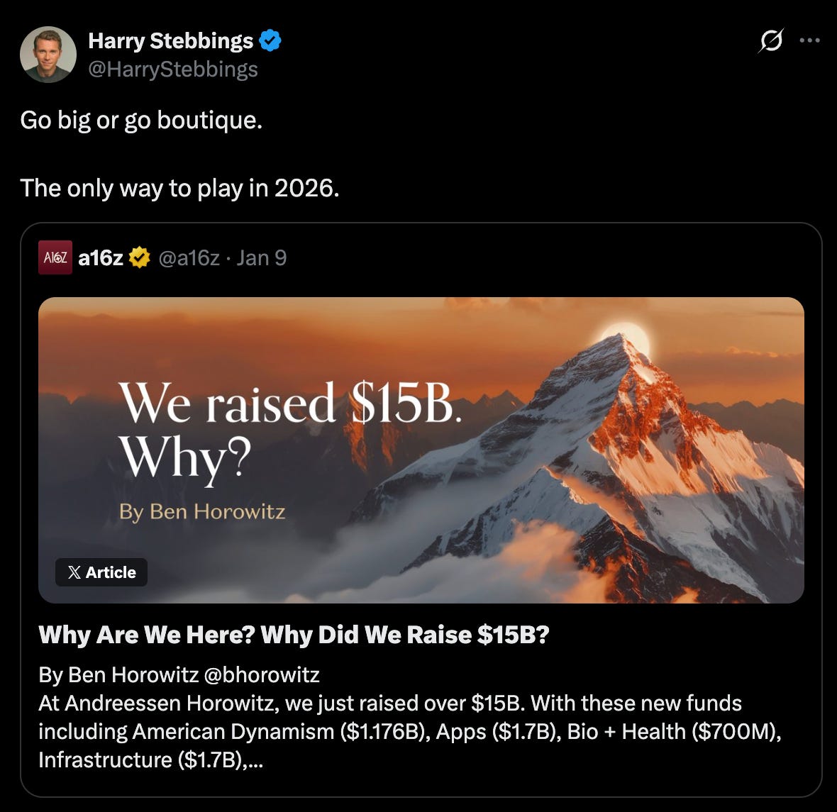 Scaled and boutique will both be fine, it’s the middle that’s in trouble: the funds that are too big to afford to miss out on the mega-winners, but too small to compete with bigger firms who can structurally offer a better product for founders. a16z is unique in that it’s both sides of the barbell—a collection of specialized boutique firms benefiting from a scaled platform team.