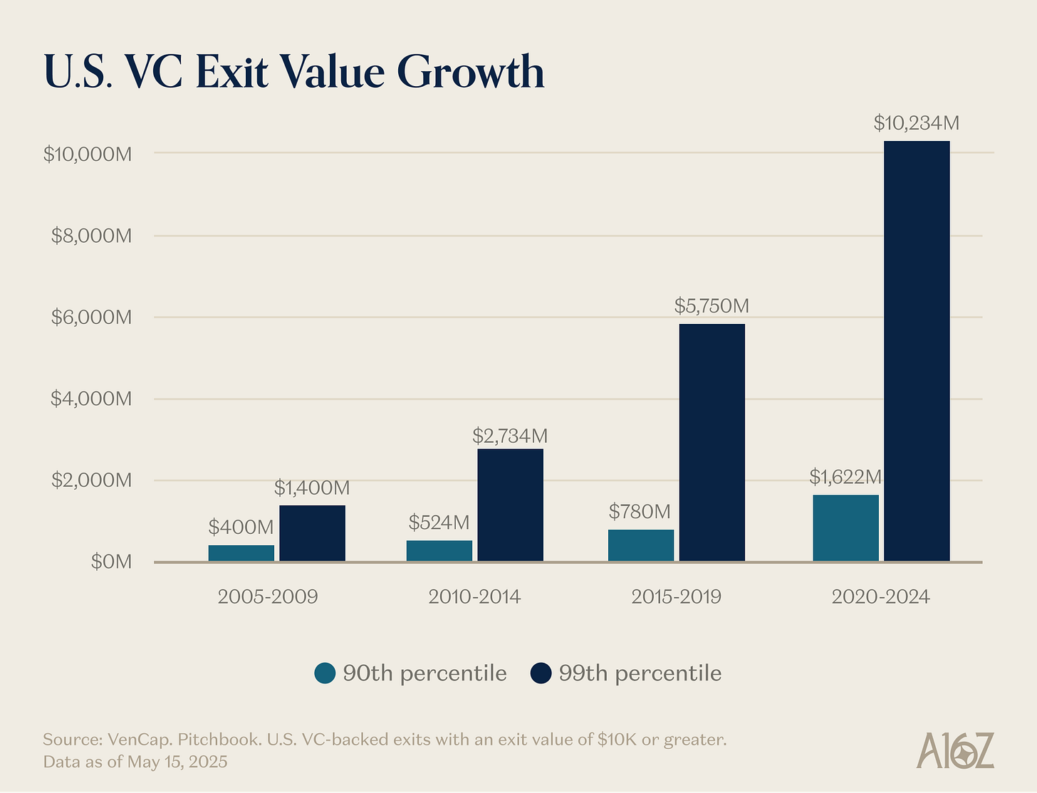 Which brings us to why the second claim—that there’s too much capital chasing too few companies—is false. Outcomes are much bigger than they used to be, the world of software is much more competitive, and companies are going public at a much later stage than they used to. All of this means that great companies simply need to raise a lot more capital than they did before. Venture capital exists to invest in new markets. What we’ve learned, over and over again, is that in the long run new markets are always much larger than we anticipate. The private markets have matured enough to support the very best companies at unprecedented scale—just look at the liquidity available to top private companies today—and both private and public market investors now believe in venture outcomes being extraordinarily large. We have continually misjudged how large VC as an asset class can and should be, and venture is scaling to catch up with this reality—as well as the opportunity set. The new world demands flying cars, global satellite grids, abundant energy, and intelligence too cheap to meter.