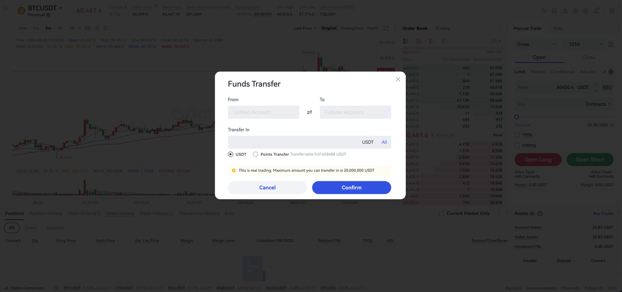- No modo de conta clássica, clique em “Transferir Fundos” no canto inferior direito para transferir valores da conta de spot para a conta de futuros.