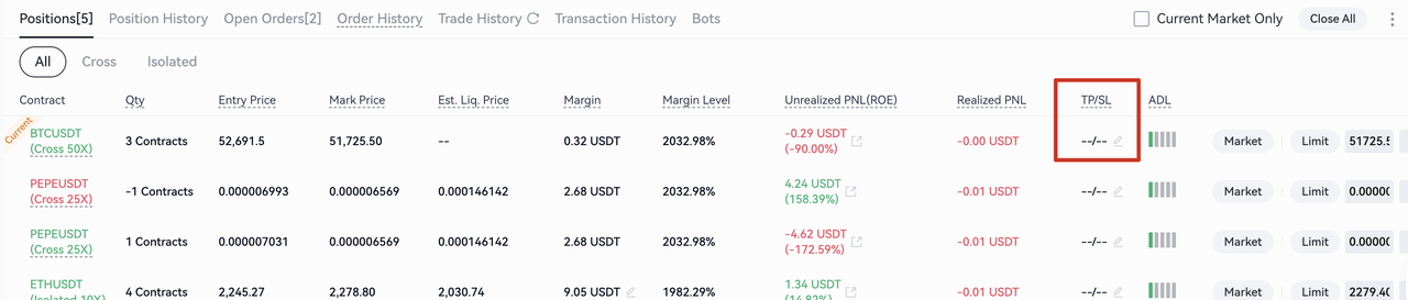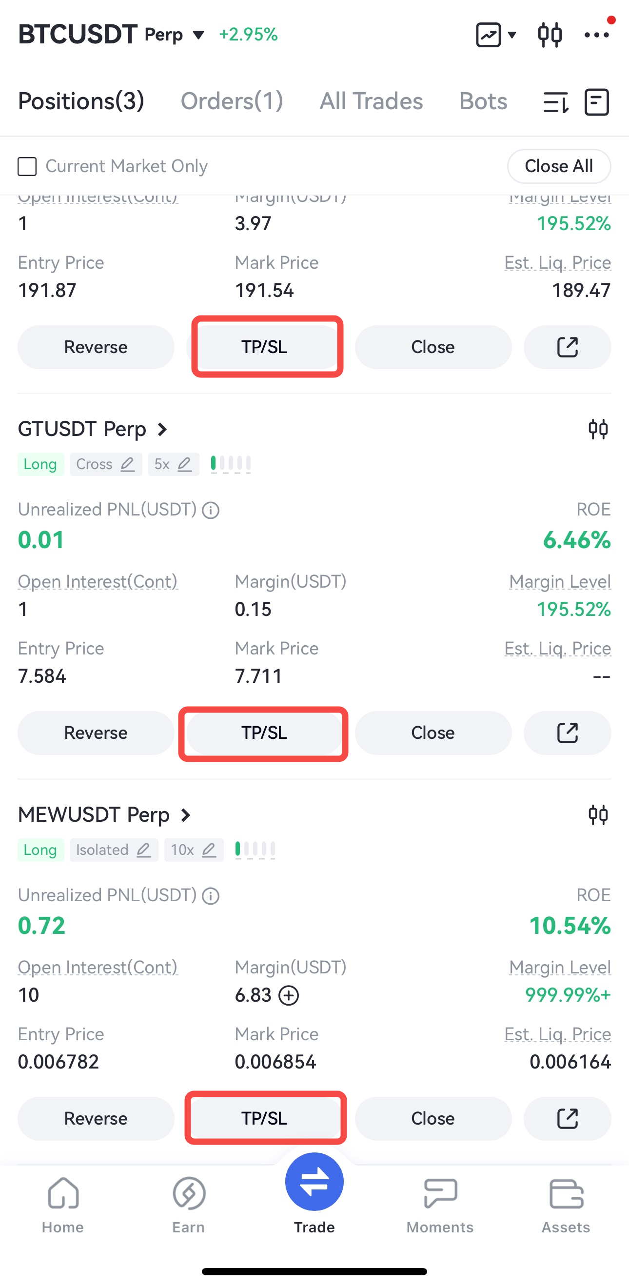 Acesse “Posições” na parte inferior da página para monitorar suas posições, verificar o preço de liquidação e configurar o Take-Profit/Stop-Loss (TP/SL).