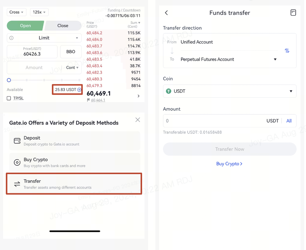 - Na página de trading de futuros, clique no ícone “+” em “Disponível” e selecione “Transferir” para mover fundos de outras contas para a conta de futuros.