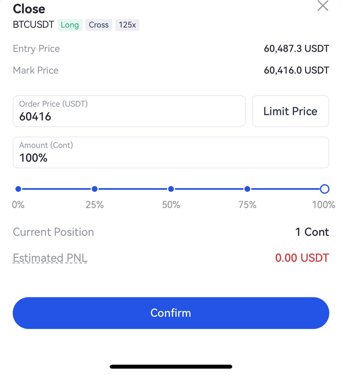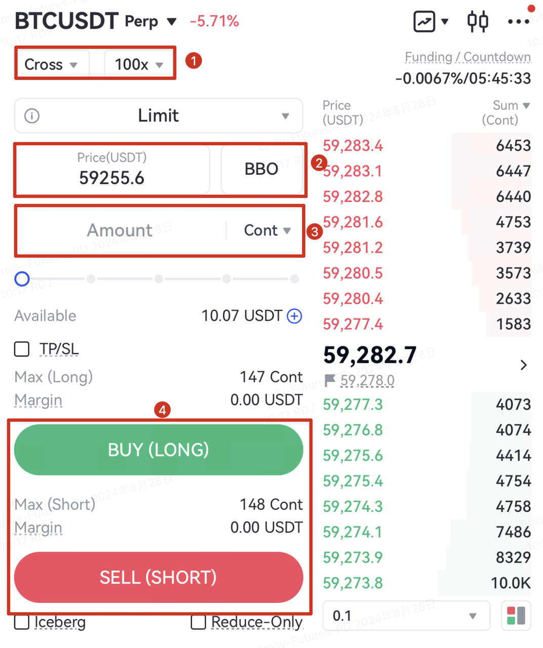 - Insira o preço, a quantidade, defina o lado da posição e clique em “Comprar (Long)” ou “Vender (Short)” para executar a ordem.